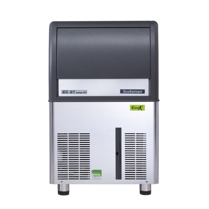 Výrobník ledu SCOTSMAN ECM 87 AS OX s odpadovým čerpadlem chlazený vzduchem produkující kloboučkový led - Gourmet Cube velikosti M. Je vybaven technologií AgION zabraňující vzniku bakterií a nepříjemných pachů uvnitř zařízení a vestavěným zásobník umožňující instalaci pod pult nebo pod pracovní desku.